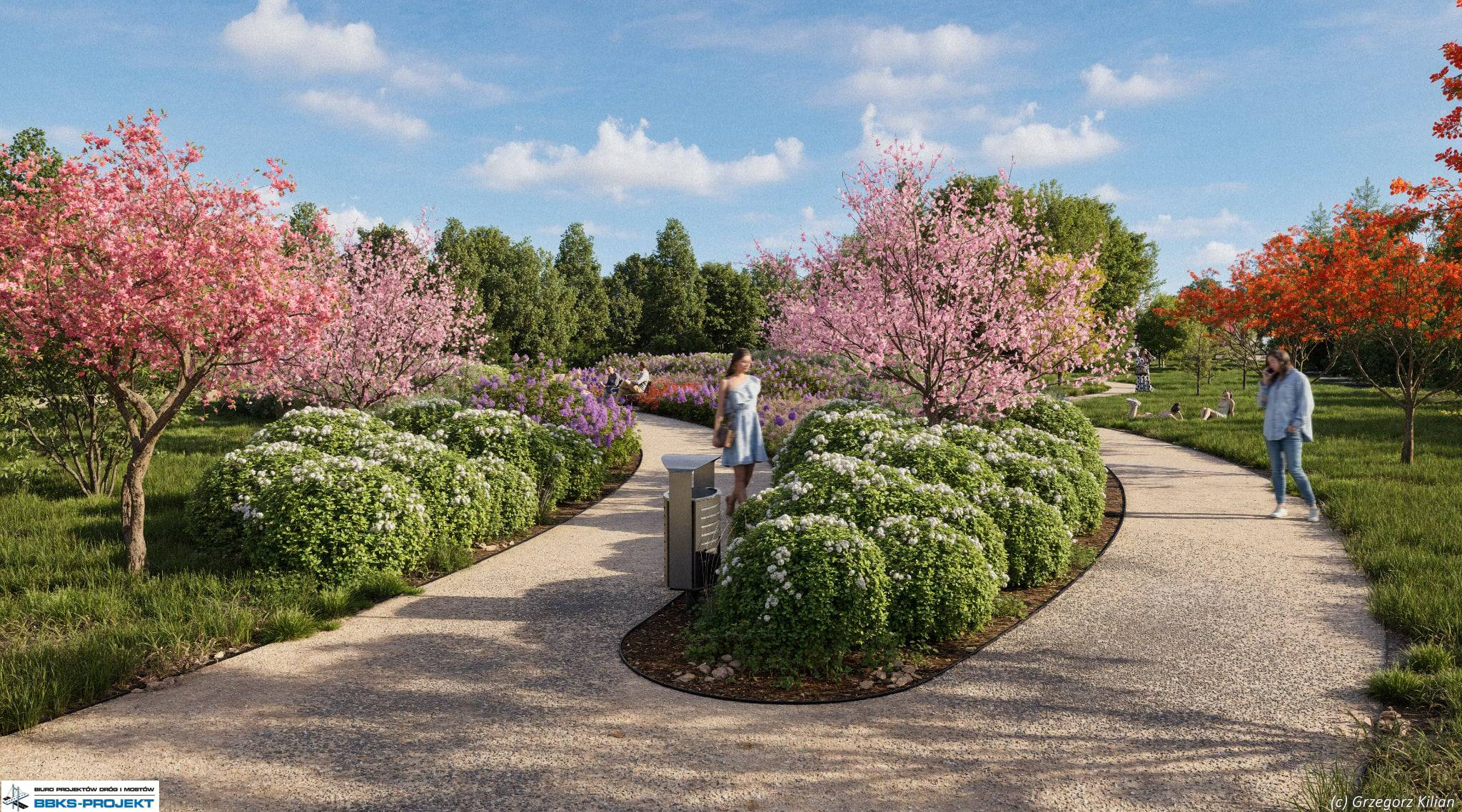 Особое внимание уделено удобству и безопасности. Здесь появятся пешеходные дорожки, велодорожки, скамейки и комфортные зоны отдыха. Важным элементом проекта станет новый пешеходно-велосипедный переход через улицу Fieldorfa, который улучшит транспортную связность района и снизит риск для пешеходов и велосипедистов.