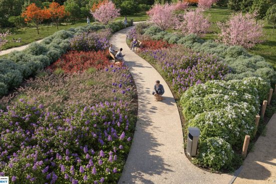 Проект Wyspa Rodos задуман как гармоничное общественное пространство, где природа и городская инфраструктура работают вместе. На территории высадят 76 деревьев, около 2000 кустарников, 768 декоративных злаков и 300 луковичных растений, благодаря чему площадь будет выглядеть по-разному в каждый сезон. Весной и летом пространство превратится в яркий цветущий парк, а осенью — в спокойную природную зону с мягкой палитрой трав и листвы.